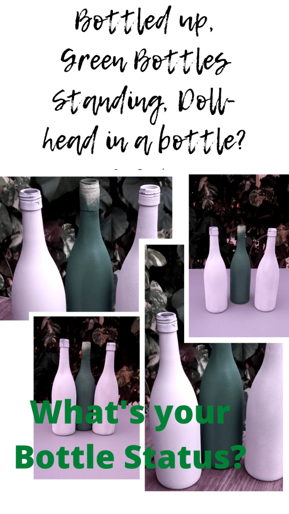 “Bottled Up,” “Broken Bottles,” “Green Bottles Standing on the Wall,” “Baby Bottle,” new and en vogue, “Bottle Art,” and one that I coined, “Dollhead in a Bottle.”
